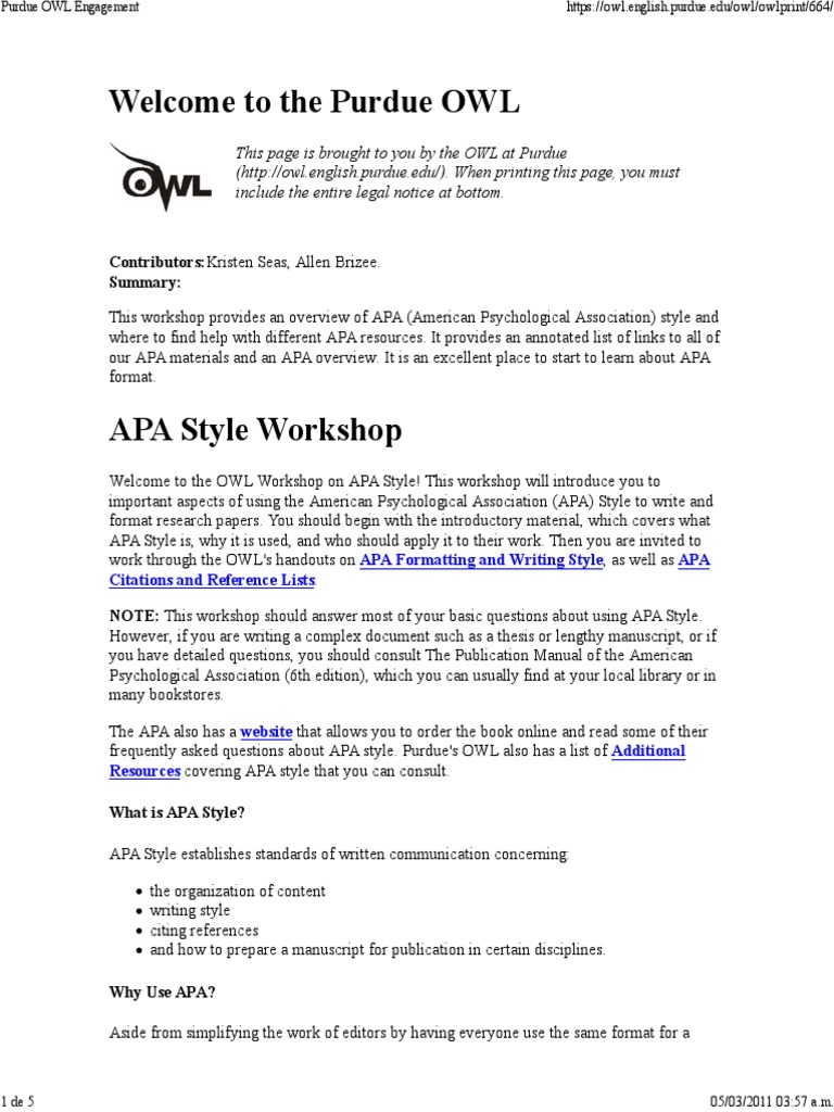 Документы, похожие на «purdue owl_ apa formatting and style guide». Apa (american psychological association) is most commonly used to cite sources within the social sciences. This page is brought to you by the owl at purdue university. Owl writing personal essay owl writing thesis statements owl.english.purdue.edu apa owlcation research paper outline format owloquent editing and writing services owls apa owls by. This is a direct copy of purdue owl's apa style presentation.